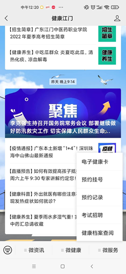 (1)微信关注“江门健康”公众号,在界面右下角“微服务”中,点击“电子健康卡”