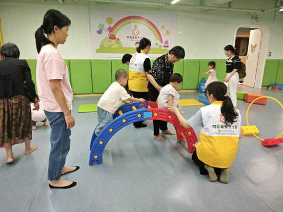 揭牌仪式结束后,雅怡社区“向日葵亲子小屋”迎来了第一节公益亲子课堂,辖区内10组亲子家庭参加本次课堂。第一节课以“大运动”为主题,根据宝宝的年龄特点,精心安排了生动有趣的音乐游戏、亲子互动等活动,加强了宝宝本体觉的锻炼,进一步培养亲子感情。