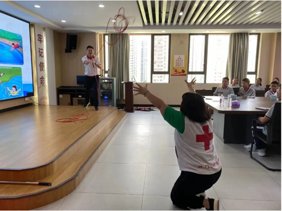 接着,黄小林围绕如何预防溺水、水中自救、对溺水者施救等内容,深入浅出地讲解了防溺水安全知识,并利用衣服、棍子、绳子、救生圈和瓶子等物品,现场演示了防溺水“叫、伸、抛”三招的操作。讲课过程中,同学们认真听讲、做笔记,踊跃发言,积极互动。