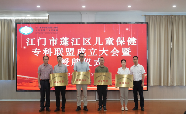 为深入实施“百千万工程”,进一步提升蓬江区儿童保健工作服务质量,共建共享儿童保健工作的新技术、新业务,更好地满足人民群众日益增长的妇幼保健新需求,10月25日下午,在蓬江区卫生健康局的指导与推动下,由江门市第二人民医院(以下简称“市二医院”)牵头,辖区内 9 家医疗单位共同组建的“江门市蓬江区儿童保健专科联盟”成立,并举行了签约暨授牌仪式。