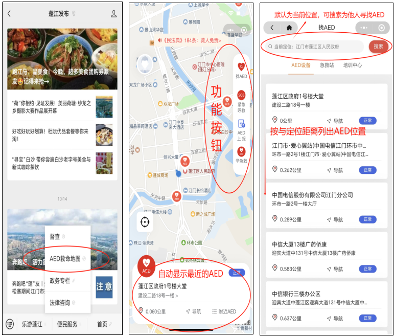 近日,“蓬江发布”公众号新增一个服务项目“AED”救命地图项目,直接链接“AED城市地图”小程序,点击进入后(具体操作步骤见下图),蓬江区辖区范围106台正常运行的AED位置清晰可见,可以帮助我们在“黄金四分钟”内找到AED等急救设备。同时还有查找附近AED并导航、呼救紧急联系人、呼救附近救援者、一键拨打120、新增AED设备上报、报名学急救等功能,将专业医疗急救力量和社会志愿急救力量形成联动,构建院前生命安全保障网络。