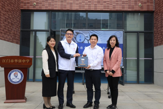 3月4日,江门市华侨中学举行第二台AED装机配置仪式,该校党支部书记、校长李兴伟在仪式上表示:“生命教育是校园工作的核心,AED的配置不仅是硬件升级,更是对‘黄金四分钟’救援理念的实践。”,这台AED的引入得益于家长志愿服务队的积极努力。家委会会长高春晓介绍,2024年通过“5·8人道公益日”“九九公益日”众筹活动,全校家长踊跃参与,共筹得善款3.3万余元,专项用于AED配置及急救培训,充分展现了家校协同的强大公益力量。