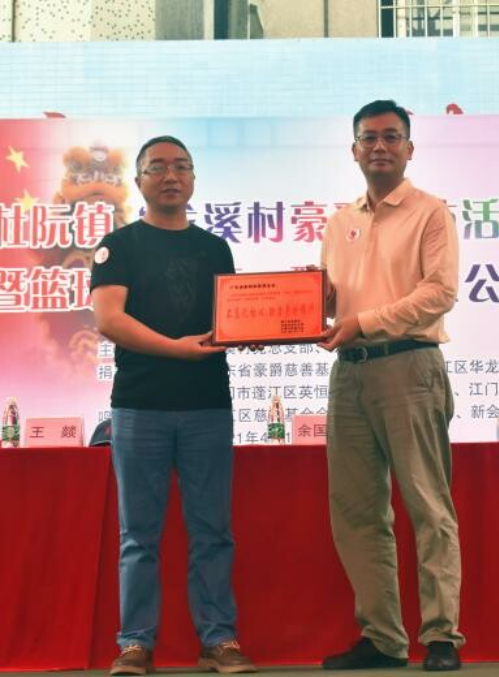 龙溪村负责人向广东省豪爵基金会理事长仵岩赠予纪念牌匾。2019年,广东省豪爵慈善基金会向蓬江区慈善会定向捐赠50万元,用于资助豪爵文体活动中心升级改造工程。