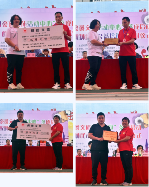 日前,蓬江区杜阮镇龙溪村委会举办龙溪村豪爵文体活动中心落成暨篮球、狮艺武术公益培训班开班仪式活动,蓬江区民政局、蓬江区慈善会、杜阮镇政府、广东省豪爵慈善基金会、爱心企业等代表和村民齐聚豪爵文体活动中心,“益”起见证乡村发展的重要时刻。活动设置赠予纪念牌匾、递交捐赠支票、揭牌等多个环节,并有精彩醒狮武术表演。