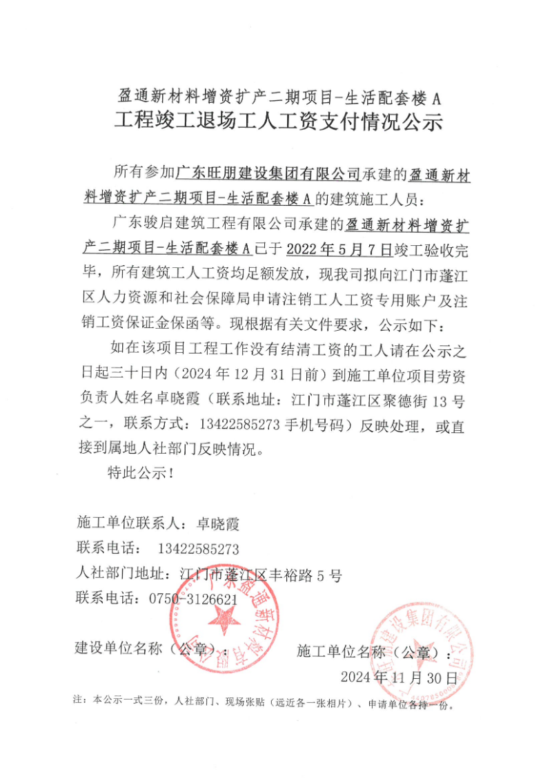 现将盈通新材料增资扩产二期项目—生活配套楼A工程《工程竣工退场工人工资支付情况公示》挂网公示如下,如发现该项目存在欠薪等相关情况的,请在30日内,请携带相关佐证材料,到施工单位项目或者人社部门反映情况。