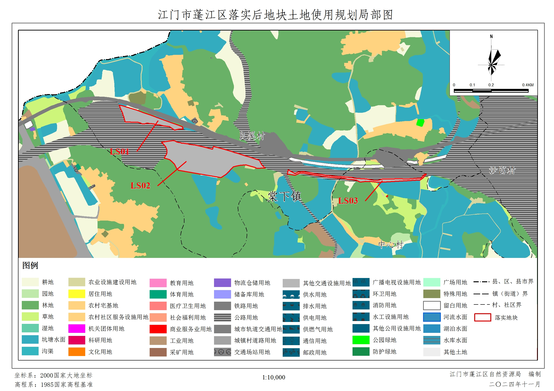 2、江门市蓬江区落实后地块土地使用规划局部图。