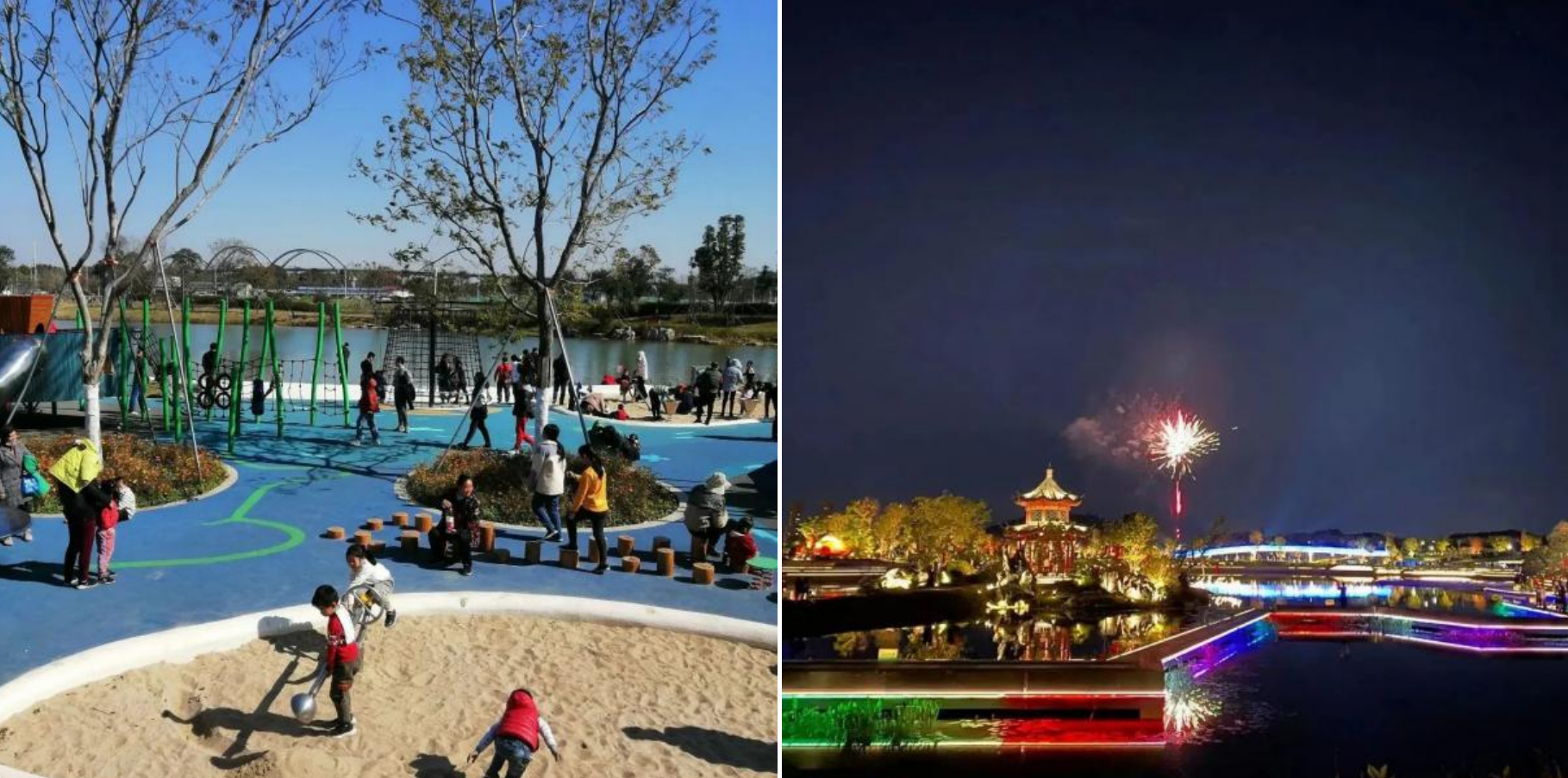 园山湖公园集自然、生态、湖面和亲水为一体,沿湖水岸设有广阔的“亲水平台”,随处可见的绿植点缀其中。每逢夜幕降临,园山湖公园里的音乐喷泉在月亮的衬托下更显得梦幻烂漫。