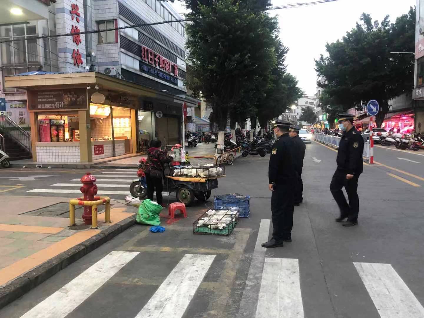 为进一步加强蓬江区疫情防控工作,按照《疫情防控工作专班工作方案》职能分工,近日,蓬江区城市管理和综合执法局组织执法巡查队,对辖区内江南批发市场、贯溪市场、幸福市场等活禽经营市场开展执法巡查,督促活禽经营市场落实广东省活禽经营市场“1110”制度的执行,并协助属地镇街指导督促活禽交易市场开办者、销售者严格遵守广东省活禽经营市场“1110”制度,规范落实“一日一清洗、一周一消毒、一月一休市、过夜零存栏”防控措施。