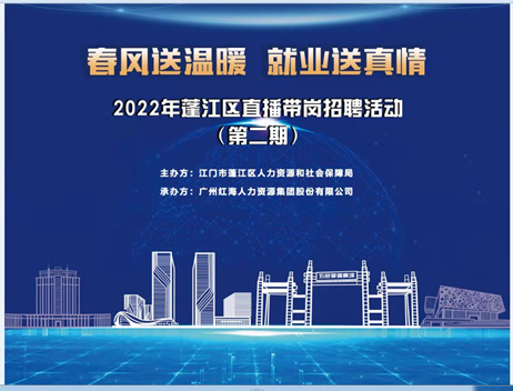 2月26日,蓬江区人社局举办2022年第一期直播带岗招聘活动后,辖区企业和广大求职者反映良好。应辖区企业需求,帮助企业缓解用工难题,3月29日,江门市蓬江区人社局举办2022年蓬江区“直播带岗”招聘活动(第二期),邀请到海目星(江门)激光智能装备有限公司、江门敬记塑胶厂有限公司5家企业入驻直播间现场,另有29家企业参加此次招聘会,现场提供2000多个优质岗位,岗位覆盖了销售、操作工、前台、财务等多个岗位工种。此次“直播带岗”招聘活动展示蓬江区重点企业的实力和需求,推荐优质岗位供广大求职者选择,为企业不断补充新鲜血液,助力推动蓬江区高质量发展。