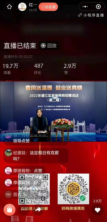 “我们海目星(江门)激光智能装备有限公司实行5天8小时工作制,加班会按照国家标准发放加班费。员工一入职即购买五险一金,实习生也会购买意外险,另有住房补贴、餐费补贴,提供有空调、独立卫生间、冷热水供应的员工宿舍……”为让求职者感受到企业文化和招聘诚意,各企业HR纷纷化身主播轮番上阵,亮出公司福利待遇,播放企业宣传片,与求职者现场互动,让求职者对企业有更为直观的了解,加大了对求职者的吸引力。同时,主持人还对蓬江区区域情况进行简单介绍,对就业创业政策进行解读,让各类惠民政策直达求职者,硬核揭秘岗位真实属性。在三个半小时的直播中,观看直播和转播人次19.7万,点赞2.9万。