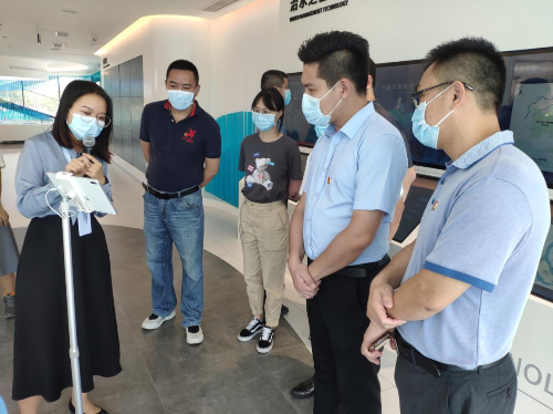 江门蓬江智水展示中心作为江门市蓬江区治水工作的重要展示窗口和广东省(江门市)环保主题教育基地,通过“宣传、展示、教育、交流”方式,在讲好“蓬江水故事”的同时,以节能、低碳、环保为主题提供体验互动场所。现场讲解员详细介绍了近年来蓬江区水环境治理工作情况,党员和团员代表通过现场讲解、视频影像和环保教育展厅深入了解江门水系发展历程和江门市、蓬江区两级政府近年来改善水环境的工作成果。
