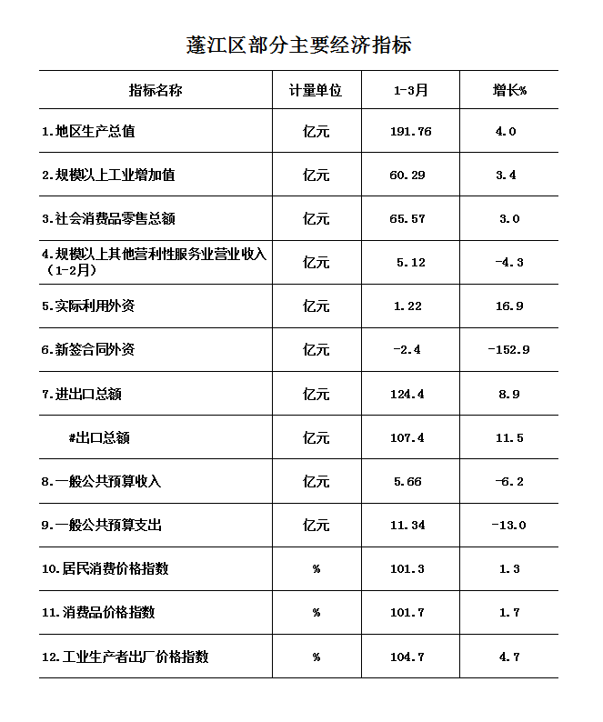 一季度,蓬江区经济发展平稳。根据江门市地区生产总值统一核算结果,2022年一季度蓬江区地区生产总值191.76亿元,同比增长4%。