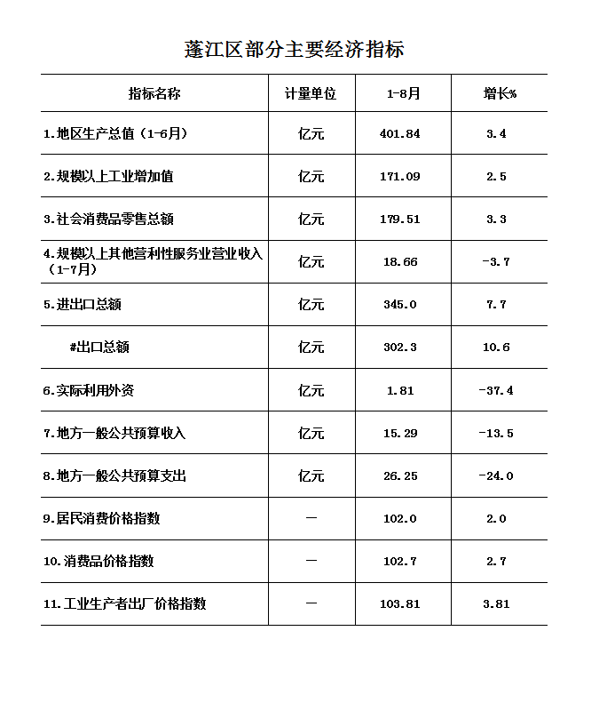 1-8月,全区地方一般公共预算收入15.29亿元,下降13.5%;地方一般预算支出26.25亿元,下降24%。
