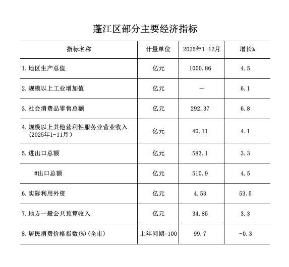 根据江门市地区生产总值统一核算结果,2025年蓬江区地区生产总值1000.86亿元,同比增长4.5%。其中,第一产业增加值9.02亿元,同比增长5.5%;第二产业增加值350.89亿元,同比增长4.9%;第三产业增加值640.95亿元,同比增长4.3%。