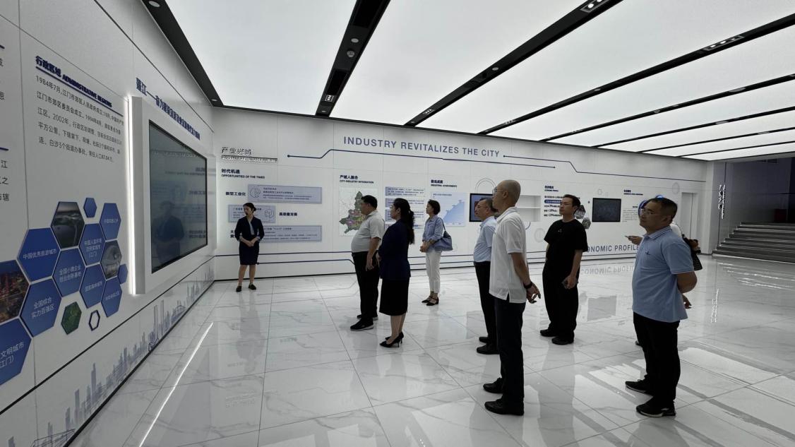 在蓬江产业会客厅,调研组通过丰富的展陈板块和宣传影片,系统了解了江门市及蓬江区经济社会发展成就、区域优势、投资环境、 营商政策以及“3+2”产业链和战略性产业集群布局,直观感受了蓬江区的区位交通优势和城市风貌。
