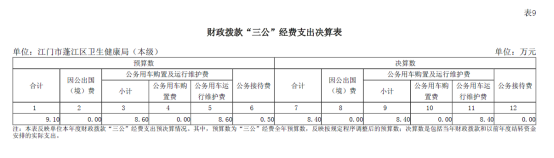 江门市蓬江区卫生健康局(本级)2024年度“三公”经费财政拨款支出决算为8.4万元,完成全年预算9.1万元的92.3%,比上年决算数增加4.6万元,增长121.1%。其中:因公出国(境)费支出决算为0万元,完成预算0万元的--%(基数为0,不可比),比上年决算数增加0万元,增长--(基数为0,不可比);公务用车购置及运行维护费支出决算为8 . 4万元,完成预算8 . 6万元的97.6%,比上年决算数增加4.6万元,增长121.1%;其中:公务用车购置支出决算为0万元,完成预算0万元的--%(基数为0,不可比),比上年决算数增加0万元,增长--(基数为0,不可比);公务用车运行维护费支出决算为8.4万元,完成预算8.6万元的97.6%,比上年决算数增加4.6万元,增长121.1%;公务接待费支出决算为0万元,完成预算0.5万元的0%,比上年决算数增加0万元,增长--(基数为0,不可比)。