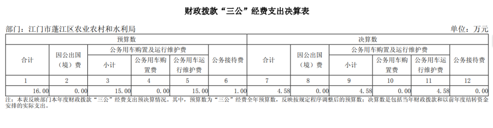 江门市蓬江区农业农村和水利局2024年度“三公”经费财政 拨款支出决算为4.58万元,完成全年预算16万元的28.6%,比上年 决算数增加0.97万元,增长26.9%。其中:因公出国(境)费支出 决算为0万元,完成预算0万元的--%(基数为0,不可比),比上 年决算数增加0万元,增长--(基数为0,不可比);公务用车购置及运行维护费支出决算为4.58万元,完成预算15万元的30.5%, 比上年决算数增加1.09万元,增长31.2%;其中:公务用车购置支出决算为0万元,完成预算0万元的--%(基数为0,不可比),比上年决算数增加0万元,增长--(基数为0,不可比);公务用车运行维护费支出决算为4.58万元,完成预算15万元的30.5%,比上年决算数增加1.09万元,增长31.2%;公务接待费支出决算为0万元,完成预算1万元的0%,比上年决算数减少0.12万元,下降 100%。