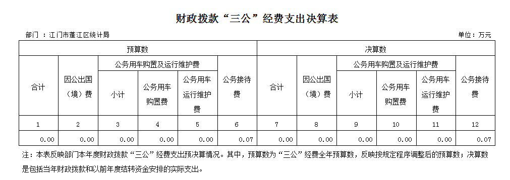 江门市蓬江区统计局2024 年度“三公”经费财政拨款支出决算为0.07万元,完成全年预算0.07万元的100%(基数为0,不可比) 。其中:因公出国(境)费支出决算为0 万元,完成预算0 万元的--%(基数为0,不可比) ;公务用车购置及运行费支出决算为0 万元,完成预算0 万元的--%(基数为0,不可比) ;公务接待费支出决算为0.07 万元,完成预算0.07万元的100%(基数为0,不可比) 。