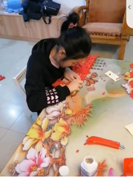 ▲紫沙小学三年级学生唐何美思剪纸花迎新年