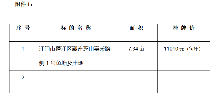 (一)基本情况:出租地块位于:江门市蓬江区潮连芝山嘉禾路侧1号鱼塘及土地(详见附件1)。土地租赁年期:2年,自签订交地确认书之日起计。