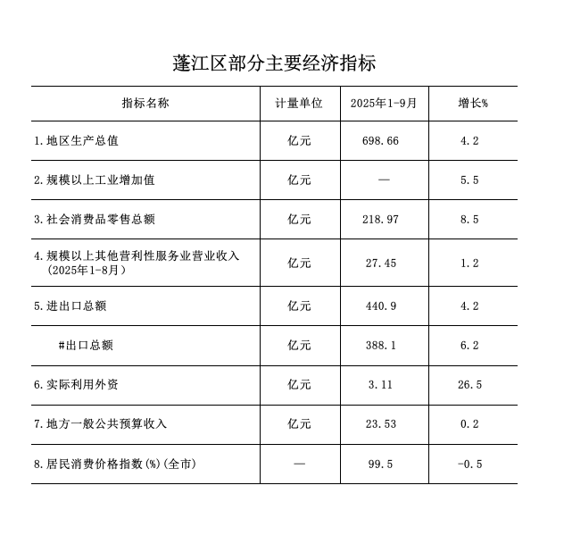 根据江门市地区生产总值统一核算结果,2025年前三季度蓬江区地区生产总值698.66亿元,同比增长4.2%。其中,第一产业增加值5.41亿元,同比增长4.6%;第二产业增加值242.39亿元,同比增长2.9%;第三产业增加值450.86亿元,同比增长4.8%。