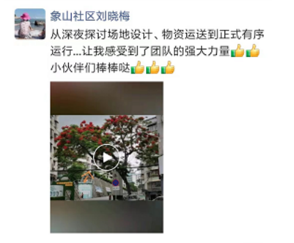 “从深夜探讨场地设计、物资运送到正式有序运行……让我感受到了团队的强大力量,小伙伴们棒棒哒!”这是10月31号夜里,刘晓梅更新的一条微信朋友圈信息。刘晓梅,90后,今年9月正式上任为白沙街道象山社区党委书记。