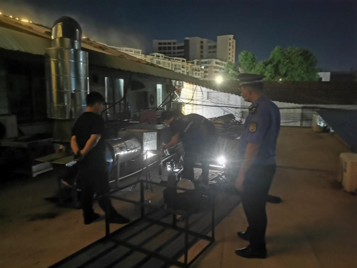 近日,蓬江区城市管理和综合执法局联合江门市生态环境局蓬江分局等部门开展蓬江区餐饮行业(入室烧烤)联合执法检查专项行动,集中整治餐饮油烟污染及占道经营行为,用实际行动助力文明城市创建常态化。