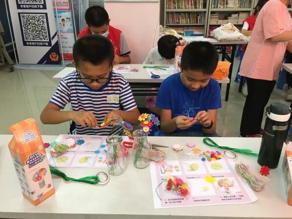 随后,志愿者给小朋友们分发了制作材料,并向大家介绍了每样材料的用途和制作纽扣花的步骤。小朋友们迫不及待地挑选自己喜欢的纽扣和花瓣,跟着志愿者一起学习制作。大家把选好的纽扣组成“花蕊”,用铁丝作为“花枝”把纽扣和花瓣串在一起再拧紧做成一朵朵纽扣花。不一会儿,一支支花朵合并成了一把花束。最后把纽扣花束放进装饰好的花瓶里便大功告成。小朋友们兴奋不已,纷纷拿起成品拍照留念。