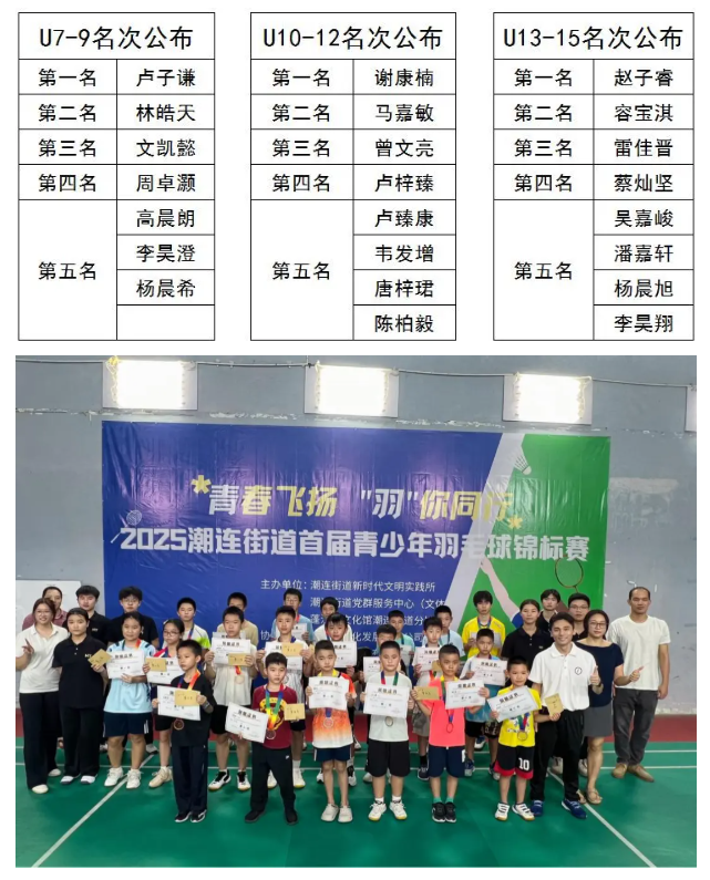 经过一天的激烈角逐,2025潮连街道首届青少年羽毛球锦标赛圆满落幕。各个组别的冠军依次产生,他们收获了荣誉与掌声,更收获了宝贵的成长经历。 本次赛事获奖名单如下: 本次赛事的成功举办,不仅为潮连街道的青少年羽毛球爱好者提供了一个展示自我的舞台,也为推动羽毛球运动的发展、培养体育后备人才奠定了坚实的基础。未来,街道将举办更多这样的赛事,让青春在运动中绽放更耀眼的光芒!