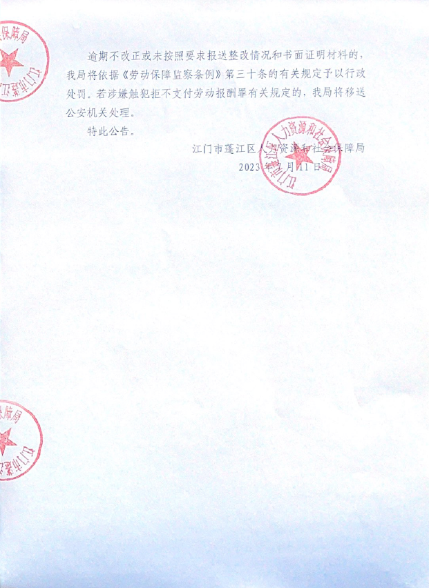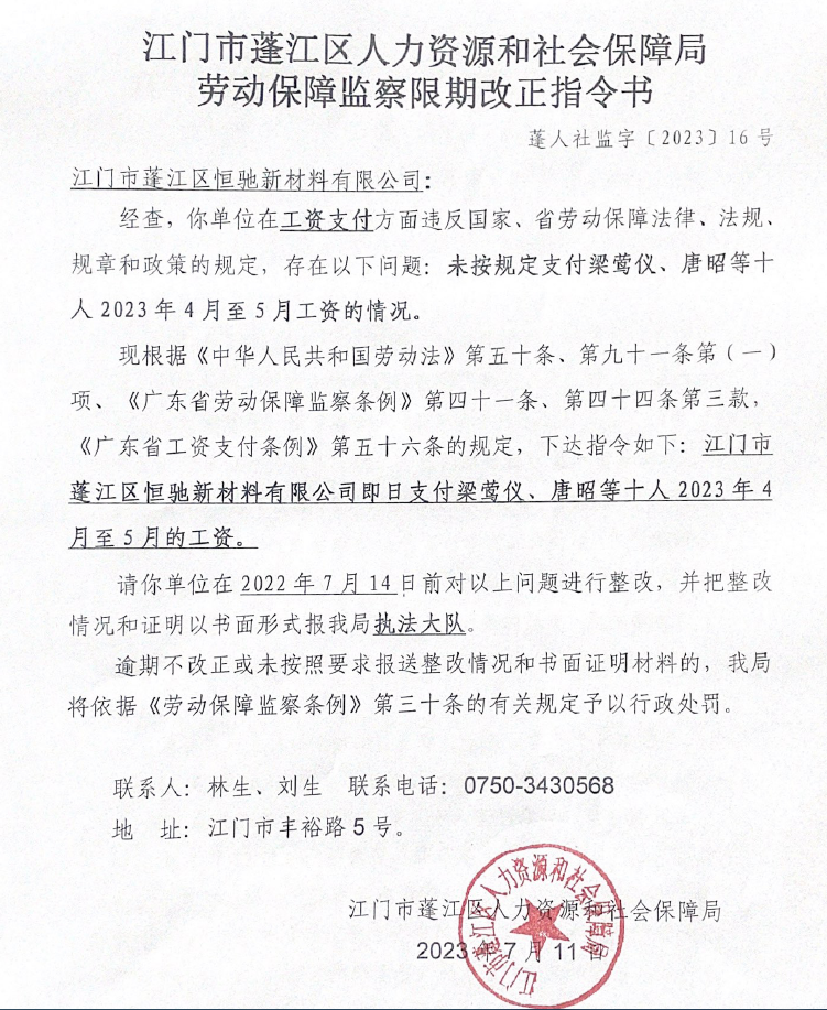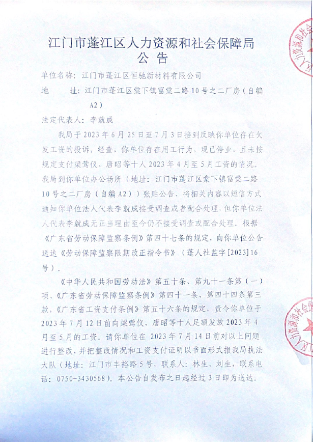 劳动保障监察限期改正指令书公告送达(江门市蓬江区恒驰新材料有限公司)