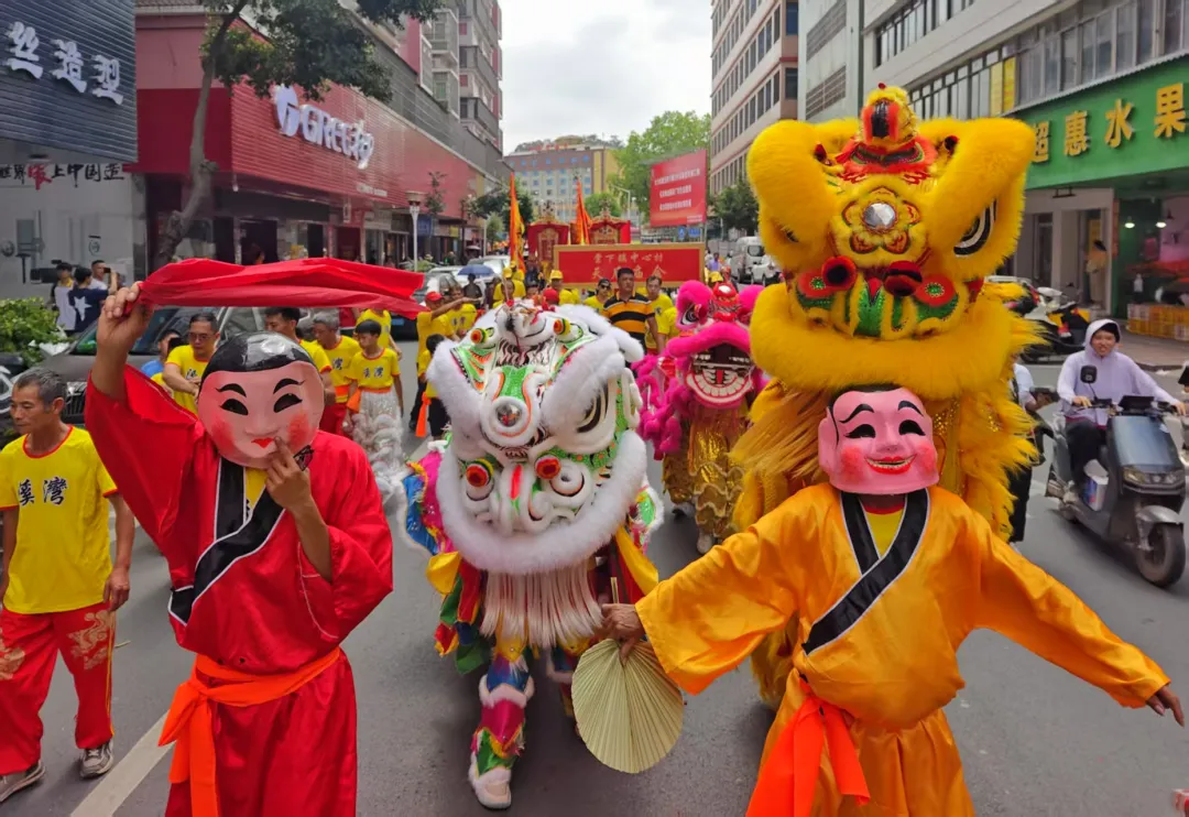 在一声声鞭炮声、锣鼓声中,巡游队伍的热情被点燃。在这支队伍中,既有成熟刚健的中年肩扛罗伞,也有稚气未脱的少年舞动龙狮。19岁的卢俊颖第一次参加活动,汗水浸透衣裳却难掩兴奋:"往年总错过,今年来凑凑热闹,天气热也不觉得累!"他所在的游龙方阵里,年轻人占了大半,年轻的脸庞与古旧的道具碰撞出奇妙的时代感。