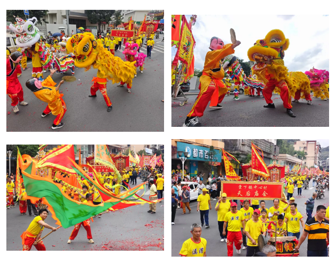 4月20日14时许,蓬江区棠下镇中心村天后宫前锣鼓震天,六大巡游方阵近200人整装待发。随着醒狮跃动,这支绵延数百米的队伍踏上巡游路,拉开了一年一度天后庙会活动的序幕。