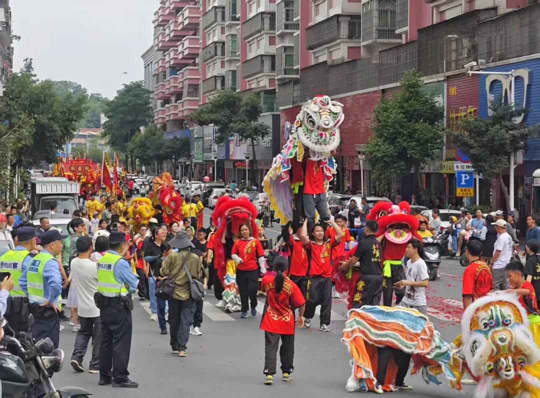 非遗武术方阵中,温永祥将狮头高高擎起,动作熟练地舞了起来,豆大的汗珠从脸颊流下。这个从小学舞狮的年轻人已记不清这是他第几次参与巡游,"场面很热闹"。他说:"巡游时感受到了群众的热情,看到他们纷纷拍照,觉得很兴奋。"正如他所言,巡游路线经过的商铺、农贸市场,挤满了围观的人群。来自蓬江区的陈女士带着两个孩子追了半程:"以前听朋友说过,特意带孩子来感受一下传统文化。"