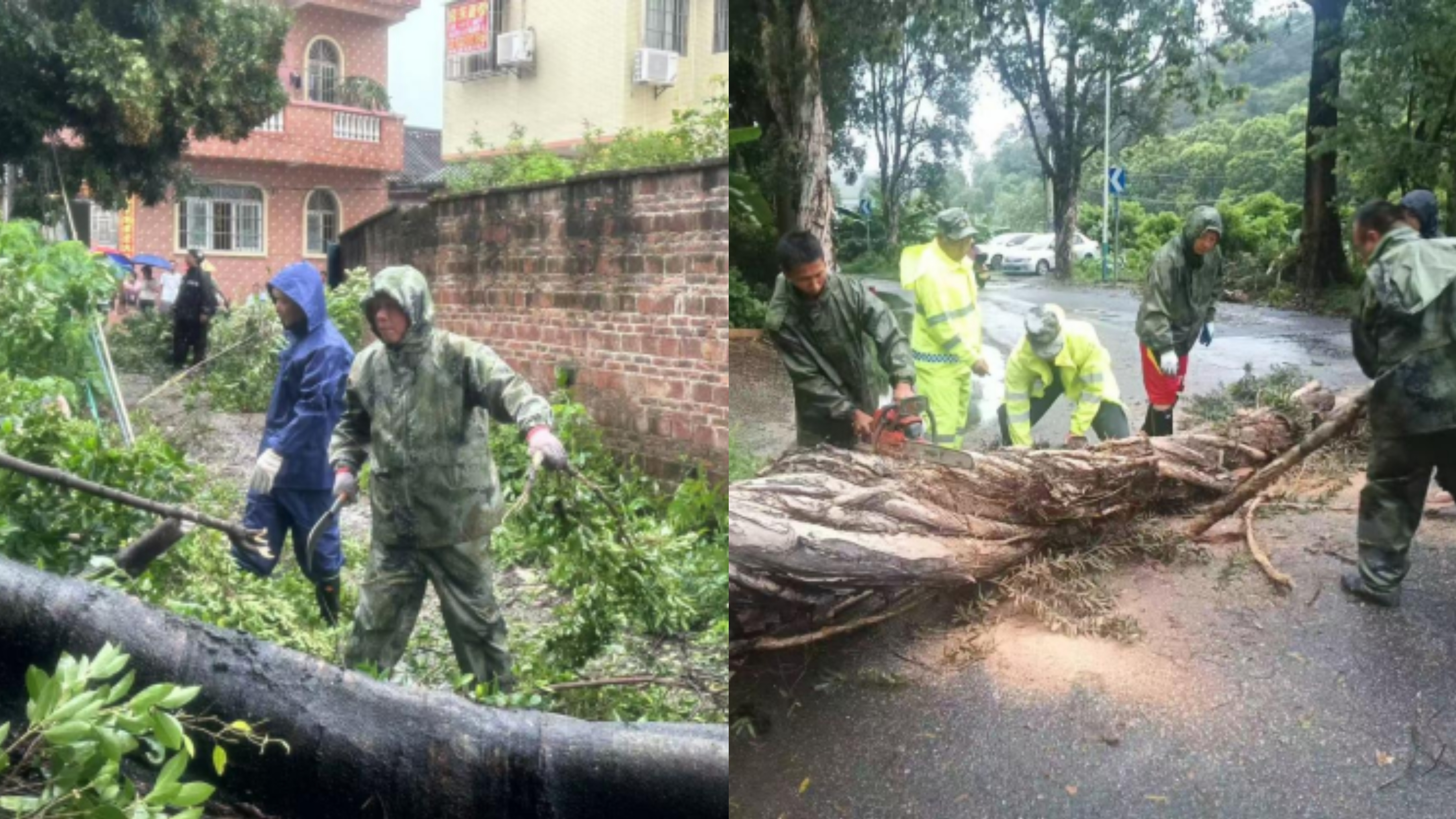 在棠下镇,棠下市场往良溪村路段出现树木倒伏、枝叶横断的情况,严重影响交通通行和居民出行。危急时刻,一群身着迷彩服的身影迅速出现在街头,他们由中心村梁耀东副书记和良溪村叶志坤副书记带队,顶风冒雨投身道路清障一线。“我们曾是军人,‘冲锋在前’是刻在骨子里的习惯。”退役士官梁耀东一边指挥队员搬运断枝,一边说道。他们手持电锯、铁锹等工具,在狂风暴雨中连续奋战3个多小时,切割粗壮树干、清理散落枝叶,通往良溪村的唯一主干道的倒伏树木被全部清理完毕,道路恢复畅通。村民谢女士动情地说:“看到穿迷彩服的他们,心里就特别踏实!”梁耀东在采访中表示:“我们曾是军人,‘冲锋在前’是刻在骨子里的习惯。”